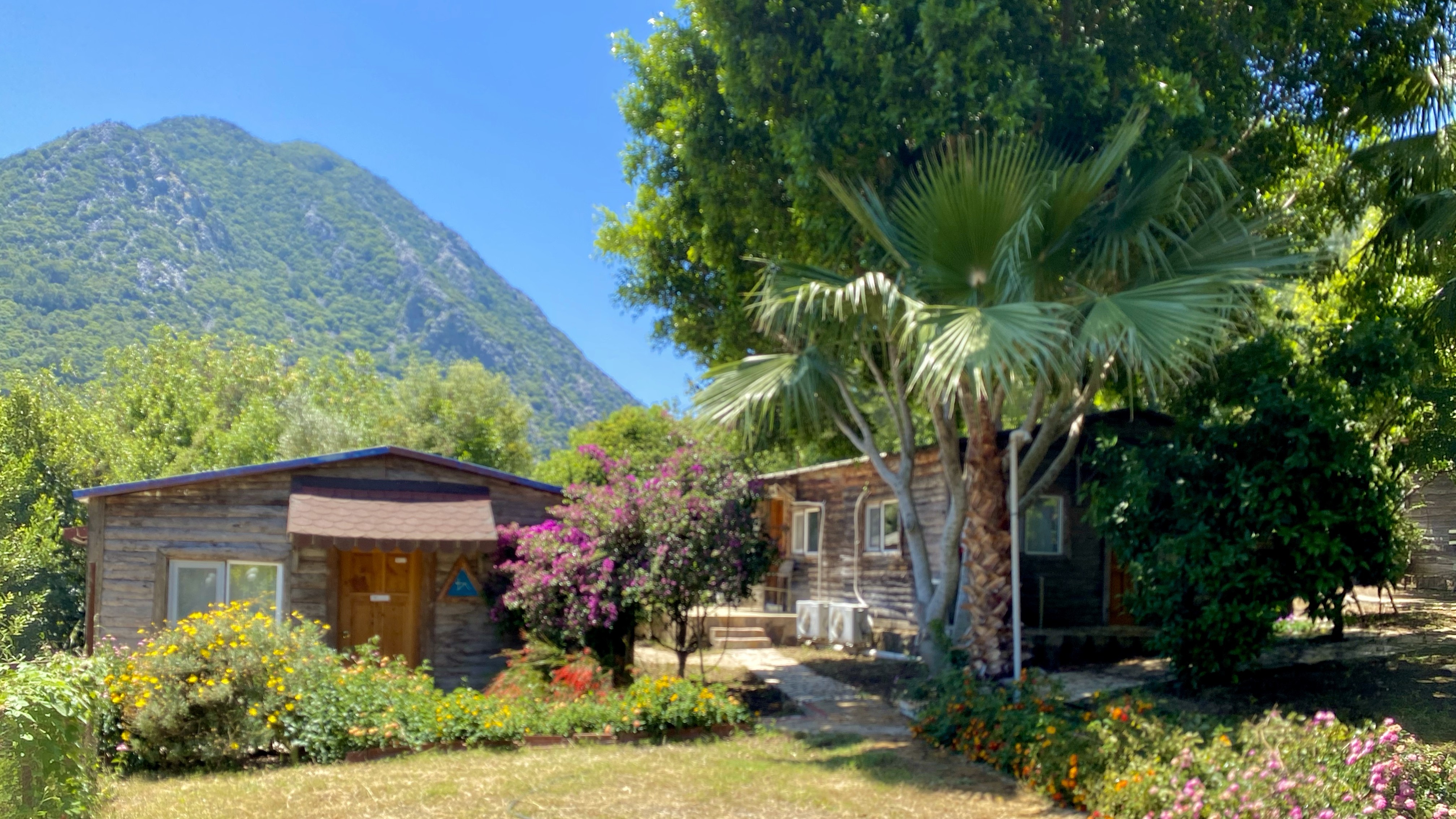 liegt am Hang, mit weitem Blick auf die Bucht von Adrasan umrahmt von einer wunderschönen Berglandschaft. Die Terrasse mit dem großen Quellwasserpool lädt mit bequemen „Köşk“, den typischen Sitzinseln und Sonnenliegen dazu ein, zu entspannen.