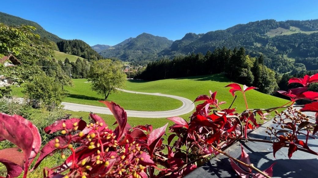 Von der Sonnenterrasse aus haben Sie einen wunderschönen Rundumblick auf das Dorf Sachrang, die Gipfel der Kampenwand oder auf den mächtigen Tiroler Zahmen Kaiser.